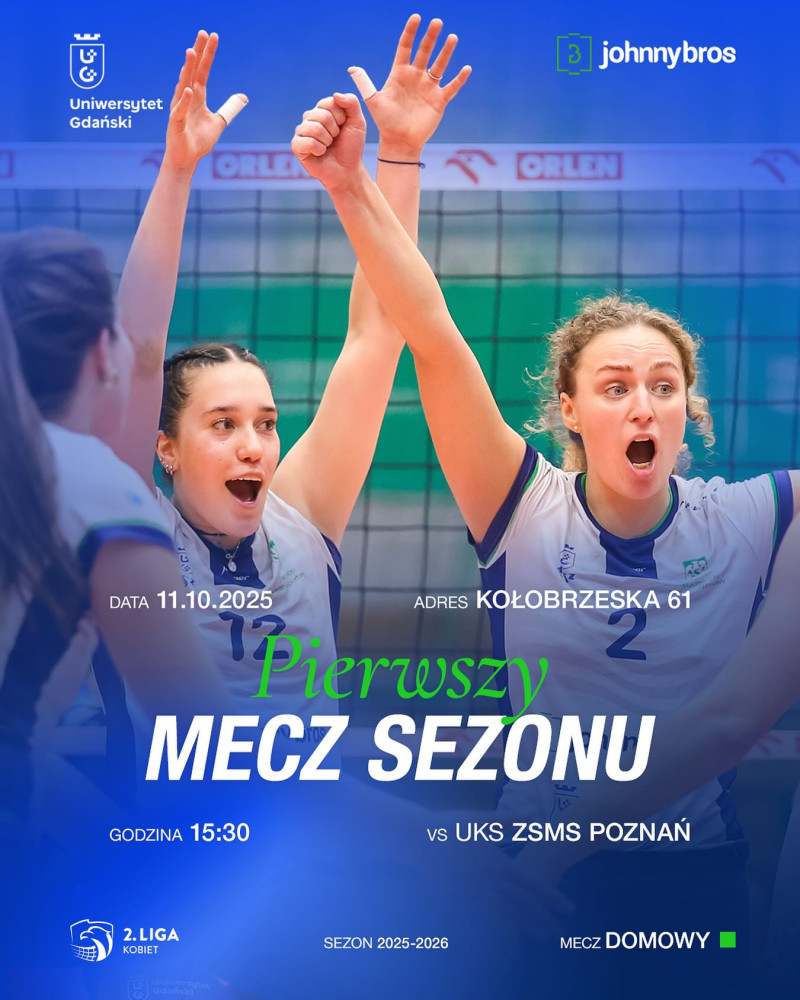 W najbliższy weekend (11-12.10.2025) trzy zespoły AZS Uniwersytet Gdański rozegrają swoje mecze ligowe. Przed własną publicznością w Miejskiej Hali Sportowej przy ulicy Kołobrzeskiej kibice będą mogli zobaczyć mecze koszykarek AZS UG i zespołu siatkarek JohnnyBros AZS Uniwersytet Gdański - wstęp na oba mecze jest bezpłatny. Zespół futsalu mężczyzn w niedzielę rozegra Derby Pomorza z Red Devils Chojnice.
